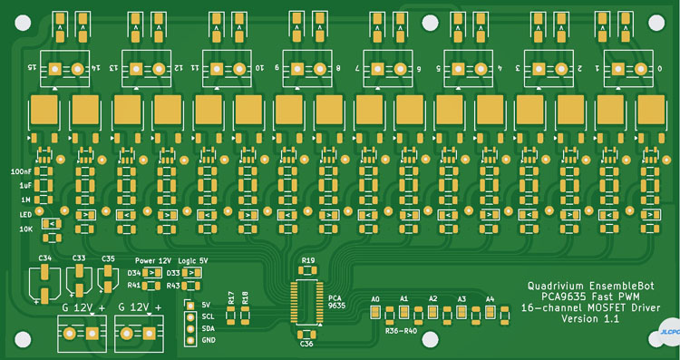 It took 3 attempts to design and manufacture a driver board that is even a candidate for testing. Because of the additional components, the board is wider than the MCP23017-based driver boards originally designed for the PipeMare project and now also used in the percussive instruments. But the layout of mounting holes and stackable connectors were made to be compatible with these smaller boards.